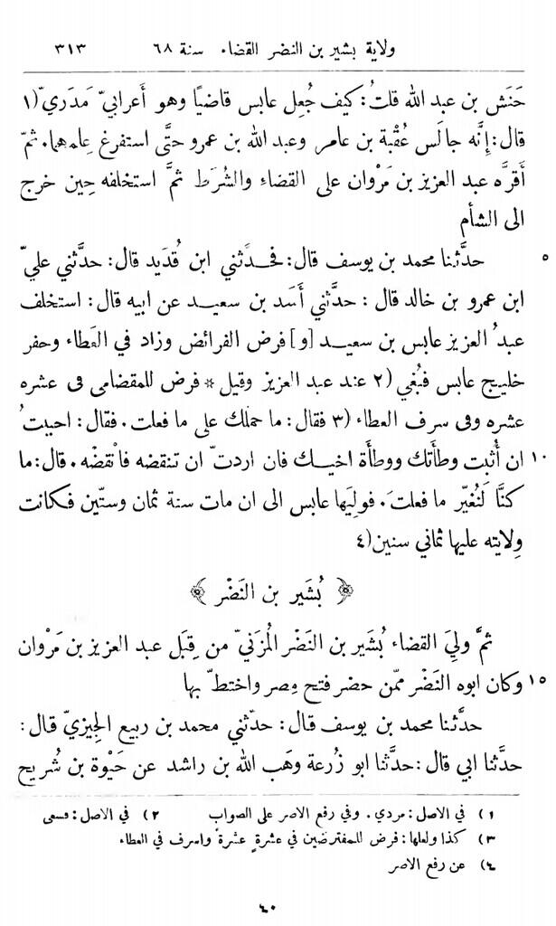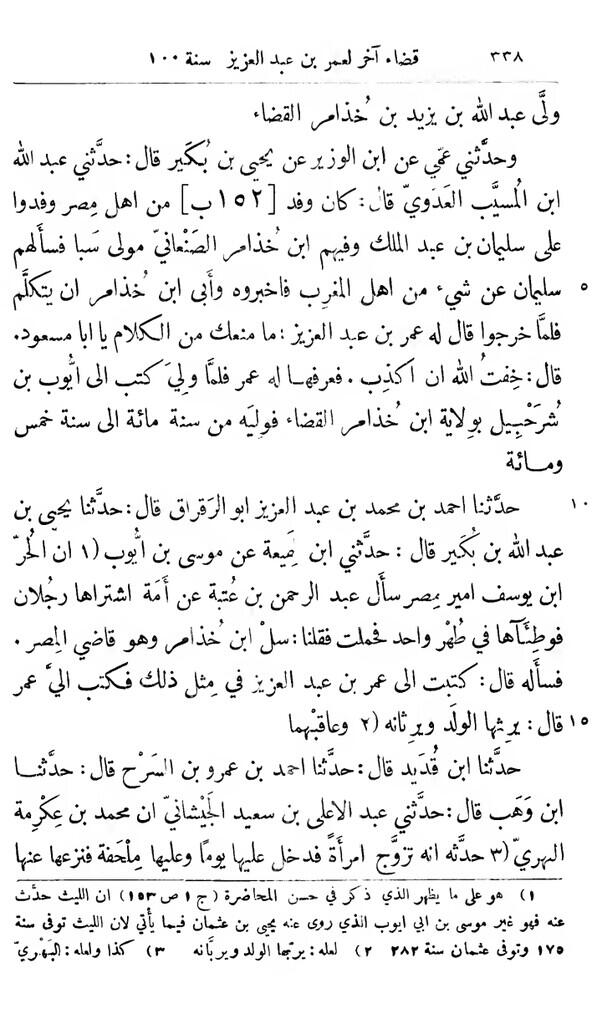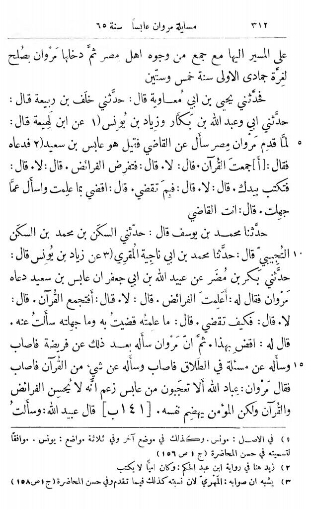 "Kemudian telah menceritakan kepada kami Yahya bin Abi Mu'awiyyah, [dia] berkata: "Telah menceritakan kepada kami Khalaf bin Rabi'ah, [dia] berkata: Telah menceritakan kepada kami ayahku, dan 'Abdullah bin Bakkar, dan Ziyad bin Yunus, [mereka] berkata: "Dari Ibnu Lahi'ah, [dia] berkata: "Ketika Marwan datang ke Mesir dia bertanya tentang qadhi dan dikatakan dia adalah 'Abis bin Sa'id, lalu dia memanggilnya dan berkata: "Apakah kamu memahami Al-Qur'an?". ['Abis] berkata: "Tidak". [Marwan] berkata: "Bisakah kamu menerapkan fara'idh (hukum warisan)?". ['Abis] berkata: "Tidak". [Marwan] berkata: "Bisakah kamu menulis dengan tanganmu?". ['Abis] berkata: "Tidak". [Marwan] berkata: "Lantas apa yang mendasarimu sebagai qadhi?". ['Abis] berkata: "[Aku memutuskan perkara] apa yang aku ketahui dan menanyakan apa yang tidak aku ketahui". [Marwan] berkata: "Kamu sungguh seorang qadhi"