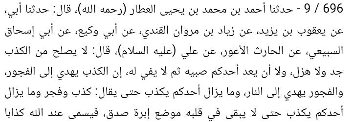 "Telah menceritakan kepada kami Ahmad bin Muhammad bin Yahya Al-'Atharr.a.h., dia berkata: "Telah menceritakan kepada kami bapakku, dari Ya'qub bin Yazid, dari Ziyad bin Marwan Al-Qandi, dari Abu Waki', dari Abu Ishaq As-Sabi'i, dari Al-Harits Al-Aur, dari 'Ali 'alaihis-salam, beliau berkata: "Tidak pantas seorang berdusta, baik ketika serius maupun bercanda ....".
