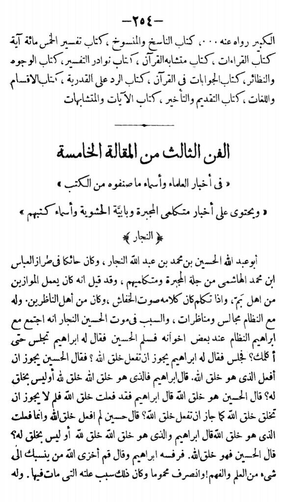 Nah, pada atestasi Ibnu Nadim di atas, Al-Husain An-Najjar adalah 'ulama dari sekte "Al-Mujbirah" yang paling menonjol, dan dia memberikan jawaban kepada Ibrahim sebuah jawaban yang tegas namun terlihat membingungkan. Di satu sisi, dia mengatakan bahwa semua ciptaan Allah itu datang dari Allah. Namun di sisi lain, dia mengatakan bahwa segala yang datang dari Allah belum tentu diciptakan Allah. Hal ini terlihat membingungkan karena kita belum memahami konteksnya. Dalam hal ini, Al-Husain An-Najjar membantah argumen Ibrahim (Mu'tazilah) bahwa semuanya adalah ciptaan Allah, karena ada yang datang dari Allah tapi bukan sebagai ciptaan Allah, yaitu wahyu Al-Qur'an. Dengan demikian, Al-Husain adalah non-Mu'tazilah, dan sekte "Al-Mujbirah" bukanlah sekte Mu'tazilah. Namun, pertanyaan kemudian timbul, apakah semua sekte yang non-Mu'tazilah berarti adalah Ahlus-Sunnah Asy'ariyyah? Tentu saja tidak. Yang menolak ajaran Mu'tazilah tidak hanya dari kalangan Asy'ariyyah, namun juga Syi'ah, bahkan juga Kristen. Misalnya, uskup Tawadrus Abu Qurrah (uskup Kristen sekte Melkites dari Harran) pernah berdebat melawan khalifah Al-Ma'mun tentang kedudukan firman Allah, dan menyatakan bahwa firman Allah bukanlah ciptaan Allah. Lantas, apakah kita ingin mengatakan bahwa Kristen Melkites adalah Ahlus-Sunnah Asy'ariyyah? Tentu saja tidak, bukan?